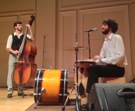 First-Timers: Ben Zito manhandled a standup bass for the first time in concert on Thursday, and Dan Rickabus laid down beats with a pared-down kit.