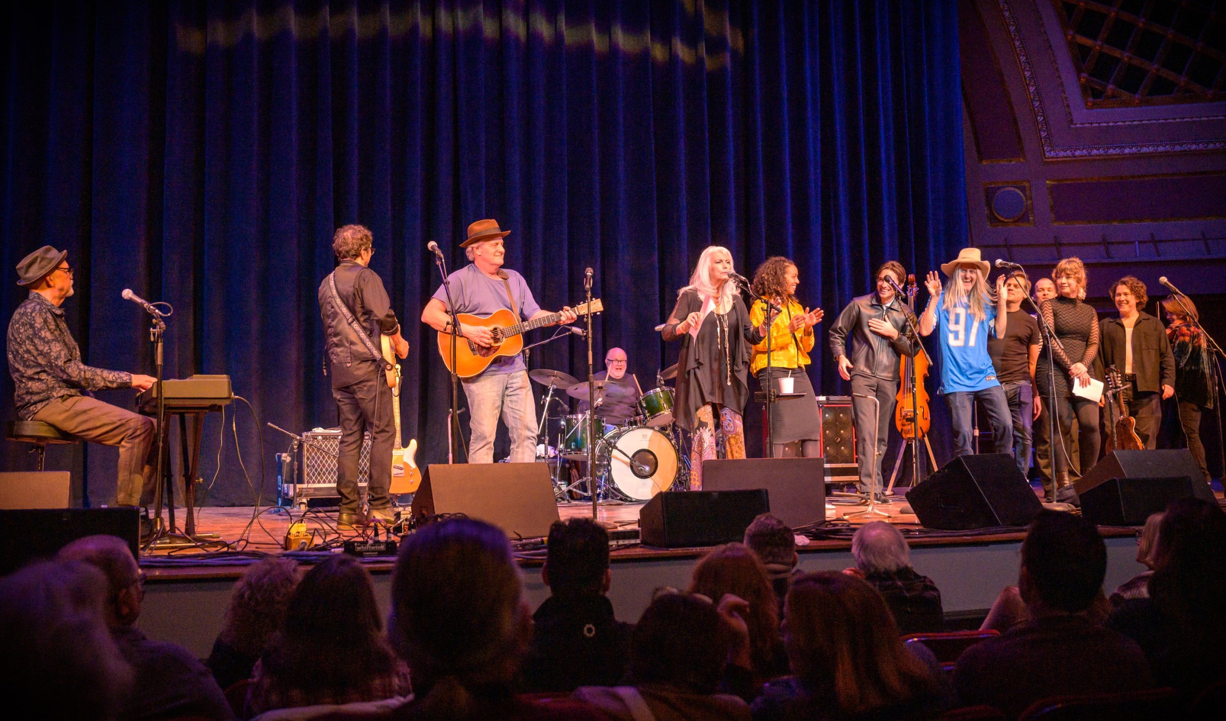 All-Star Cast: Emmylou Harris, Jeff Daniels, Michigan Rattlers and company during Saturday night’s Ann Arbor Folk Fest finale. (Photo/Andrew Rogers)