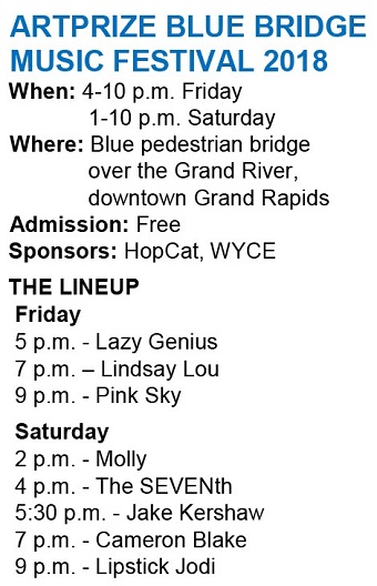 With an eclectic mix of regional stars, the Blue Bridge Music Fest will return to the pedestrian bridge in downtown Grand Rapids in late September to pump up ArtPrize 2018.