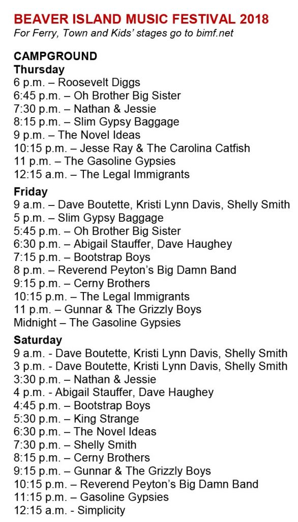 • This year’s robust lineup features Reverend Peyton’s Big Damn Band, Gunnar & The Grizzly Boys, The Gasoline Gypsies, The Legal Immigrants, Jesse Ray & The Carolina Catfish, Oh Brother Big Sister, Roosevelt Diggs, Abigail Stauffer & Dave Haughey, Slim Gypsy Baggage, The Cerny Brothers, The Novel Ideas, Nathan & Jessie, King Strange, Simplicity, MC Hosts, Dave Boutette, Kristi Davis, Shelly Smith and more. The mission of the festival which started back in 2003: “To bring attention to the beautiful world that we live in (especially Beaver Island) by uniting all of these talents and people.”