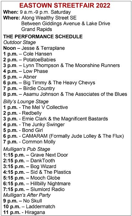 Running 9 a.m. to 9 p.m. on Wealthy Street SE between Giddings Avenue and Lake Drive, the live entertainment portion of the event will run from noon to about 9 p.m. on three different stages — an outdoor stage on Wealthy near Giddings, and indoors at Billy’s Lounge and Mulligan’s Pub.