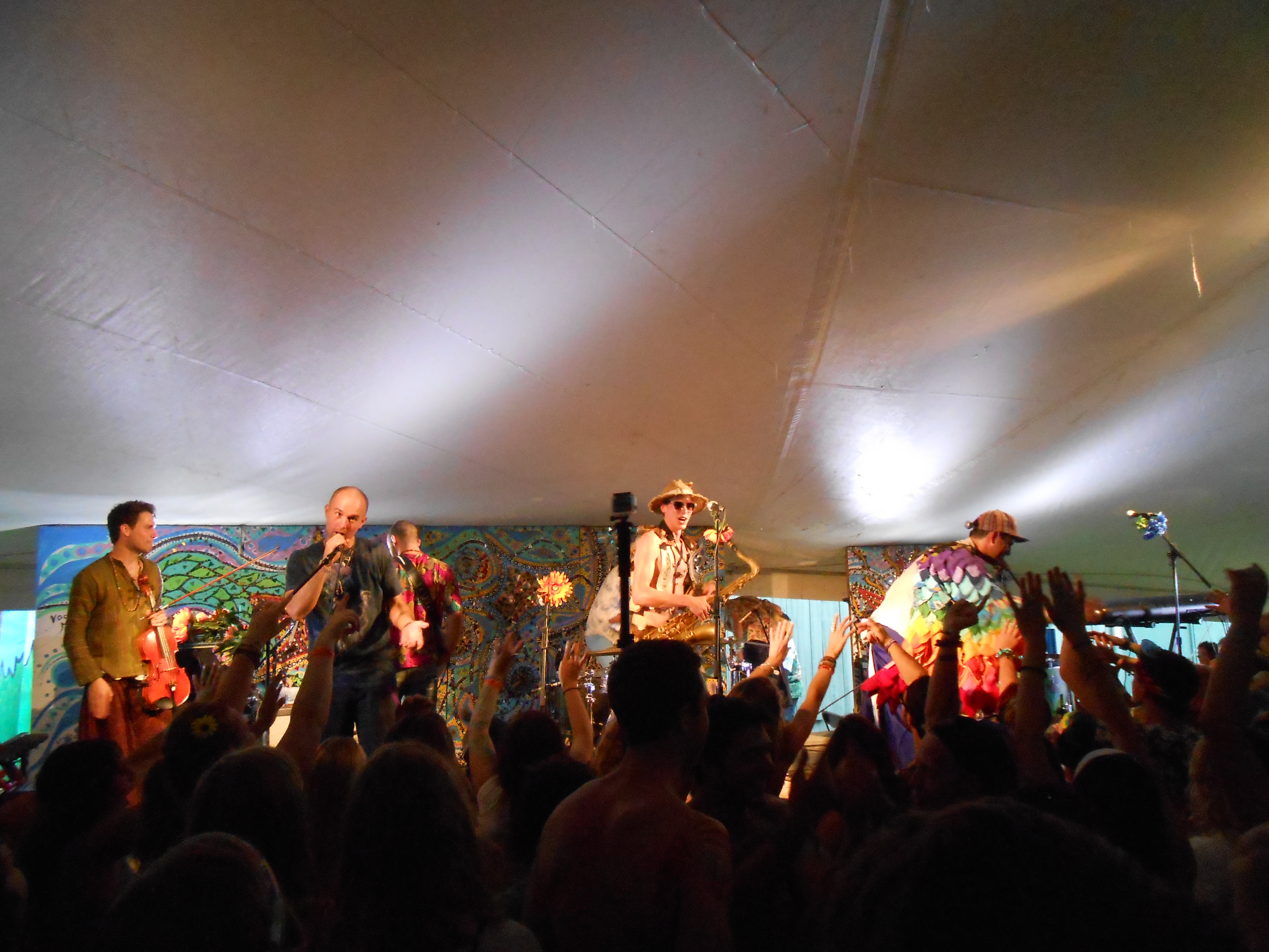 – Donna The Buffalo packing the tent-covered second stage for a late night set as the rain began to pour.