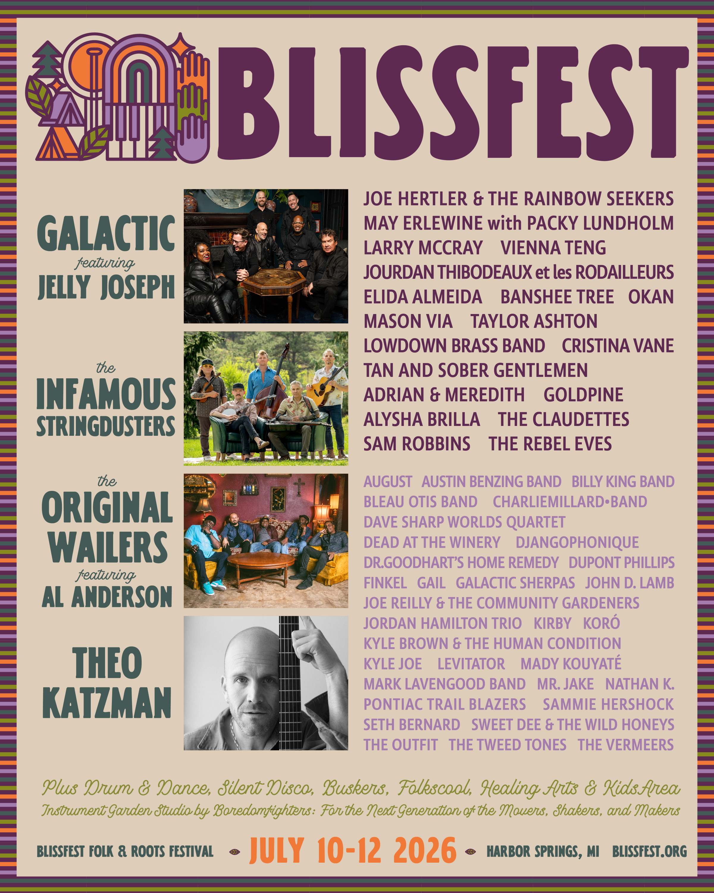 Blissfest, the iconic northern Michigan music festival taking place July 10-12, has announced that Galactic (with singer Jelly Joseph), The Infamous Stringdusters, The Original Wailers (featuring Al Anderson) and Theo Katzman will headline this year’s celebration, with Michigan favorites Larry McCray, May Erlewine and Joe Hertler & The Rainbow Seekers also on tap.