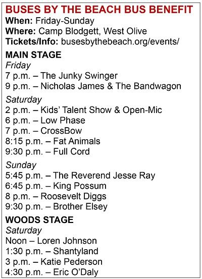 Bus Benefit continues through the weekend with raffles and silent auctions. Performances today (Saturday) will feature Low Phase, CrossBow, Fat Animals and Full Cord. Day passes are $65 and more information can be found online here.
