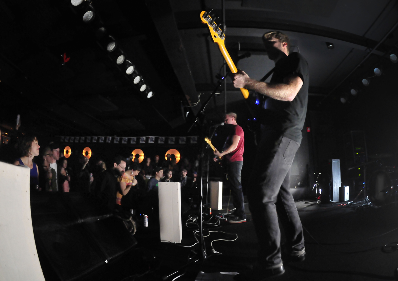 • The Pyramid Scheme celebrated its third anniversary in ultra-fine fashion on Saturday, with a sold-out, kaleidoscopic rock show featuring California indie-rock outfit Pinback, accompanied by local faves Ghost Heart and Charles the Osprey. Local Spins contributing writer Tricia Woolfenden described it thus: Ghost Heart opened by performing a strong set of previously unreleased songs. The four-piece’s percussive, dreamlike style persists, but the new material also demonstrates a new layer of sonic complexity. Charles the Osprey’s two-man attack, meanwhile, proved that theirs “go to eleven.” And headliner Pinback, the San Diego band most closely associated with vocalists/multi-instrumentalists Rob Crow and Zach Smith, offered an alternately tight and riotous 90-minute-plus set. The duo, joined by drummer Chris Prescott, covered a satisfying mix of career-spanning material, with performance of the 1999 track “Loro” reigning as one of the musical highlights. Smith, who seemed to play the straight man to Crow’s assorted stage antics, simply owned the bass. Crow, clearly in a celebratory mood, wandered several times into the crowd and at one point passed his guitar to the front row. It created an atmosphere of controlled chaos, aka “What the hell is he going to do now?”