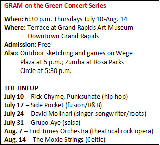 The Grand Rapids Art Museum’s GRAM on the Green series, which has offered live music on its terrace on summertime Friday nights in past years, has switched to Thursday nights for 2014 and will kick things off this week with the hip hop of Grand Rapids’ Rick Chyme and Punksuhate.
