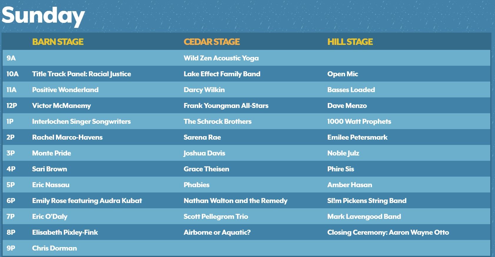 LINEUP: Airborne or Aquatic?, Ben Traverse, Charlie Millard Band, Daniel Kahn, Earth Radio, Elisabeth Pixley-Fink, Eliza Thorp, Eric O’Daly, Fake Baseball, Frank Youngman All-Stars, Funktion, G’itis Baggs, Grace Theisen, Great Lakes Brass, Gregory Stovetop, Heavy Color, Jordan Hamilton, Joshua Davis, Kait Rose & The Thorns, Loren Johnson, Mark Lavengood Band, Moss Manor, Nathan Walton & The Remedy, Nicholas James & The Bandwagon, Normal Mode, Peter Madcat Ruth’s C.A.R.Ma. Quartet, Phabies, Rachael Davis, Sarena Rae, Sari Brown, Scott Pellegrom Trio, Seth Bernard, Silver Creek Revival, The Accidentals, The AntiVillains, The Crane Wives, The Go Rounds, The Schrock Bros, Van Lente, Whorled and many more.