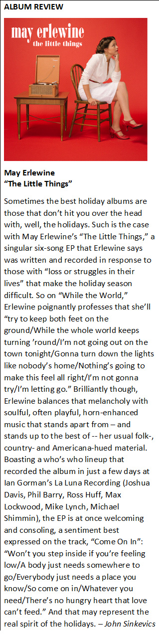 Because the holiday season for many is as much about anxiety, painful memories and tension as it is about hopefulness and joy, Traverse City-area singer-songwriter May Erlewine has written and recorded a unique new holiday EP that takes a different tack than the usual Christmas collection.