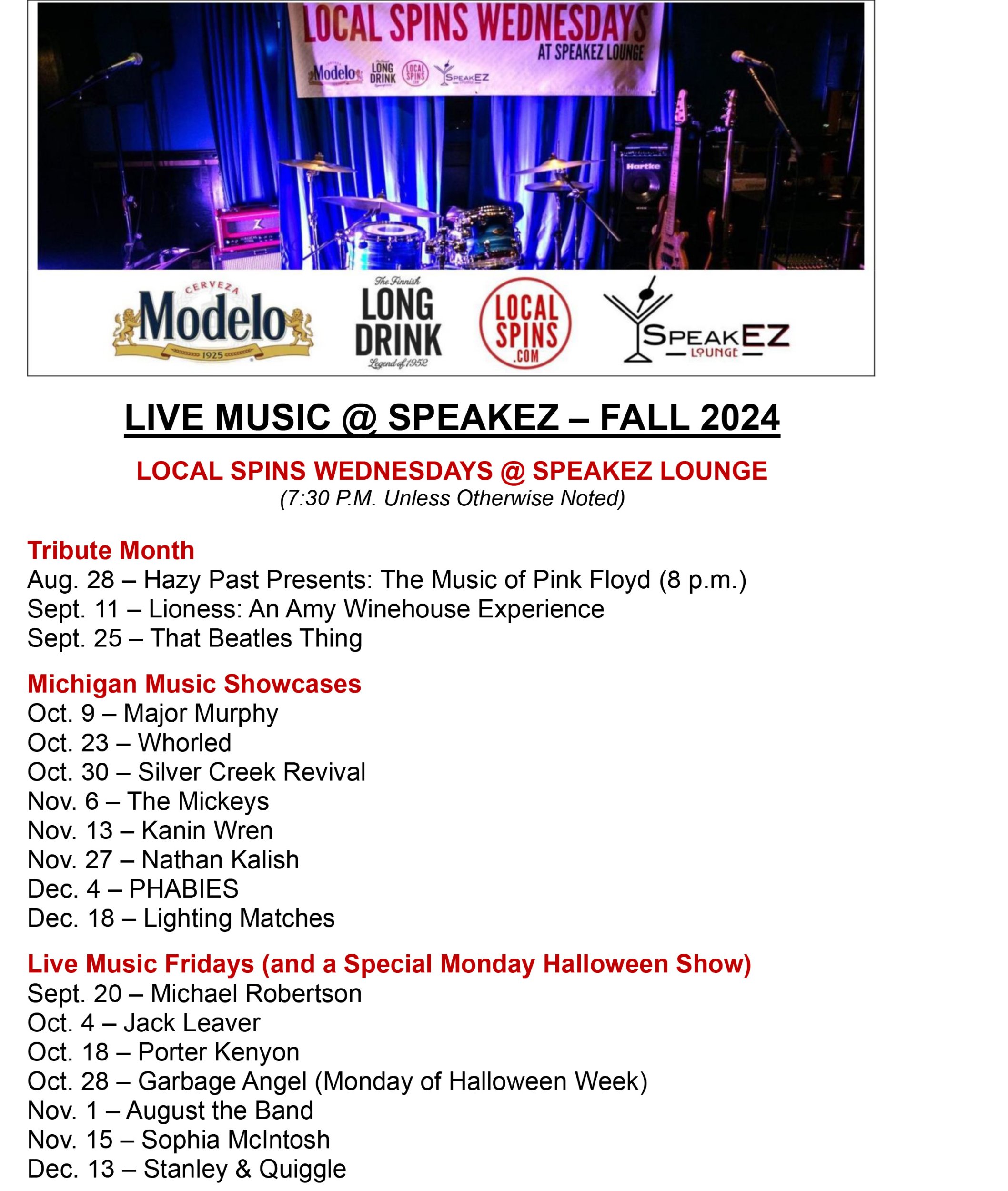 Seven shows in this every-other-week series will follow, with everything from northern Michigan Americana revelry (Silver Creek Revival on Oct. 30) to pop-rock (Phabies on Dec. 4) to indie-pop (Kanin Wren on Nov. 13) to alt-rock (Lighting Matches on Dec. 18). A $5 surcharge is added to patrons’ bills to help pay for the bands. The series is sponsored by Modelo Especial, Long Drink, SpeakEZ Lounge and Local Spins.