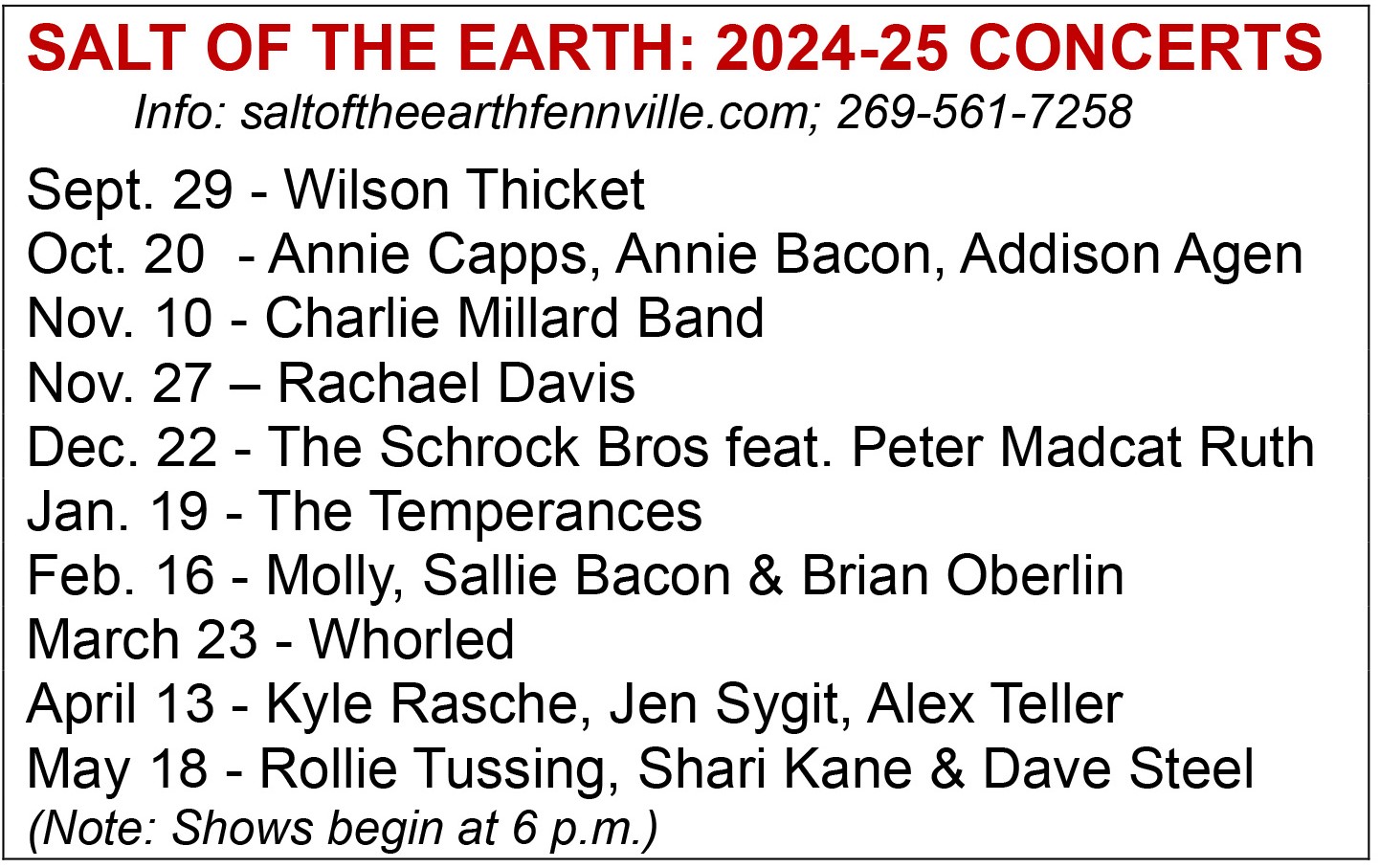 Co-owner Mark Schrock said the concerts are “presented in a unique dinner theater atmosphere” with “amazing Americana, blues, folk, world, soul and bluegrass music from Michigan’s finest.” Tickets are $25.