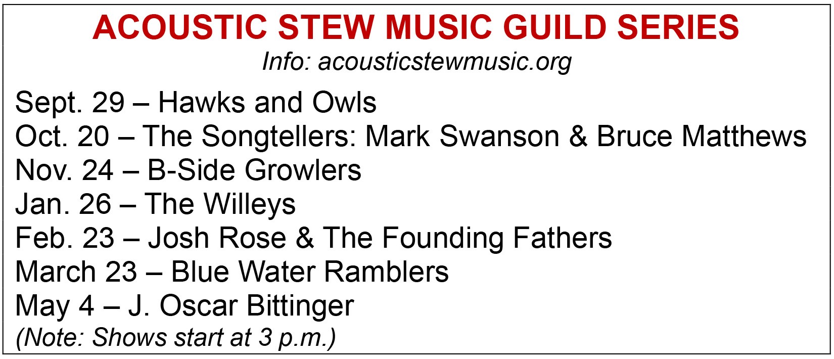 The first concert, featuring folk’s Hawks and Owls, takes place at 3 p.m. Sunday. Tickets are $20 with more information/details available online at acousticstewmusic.org.