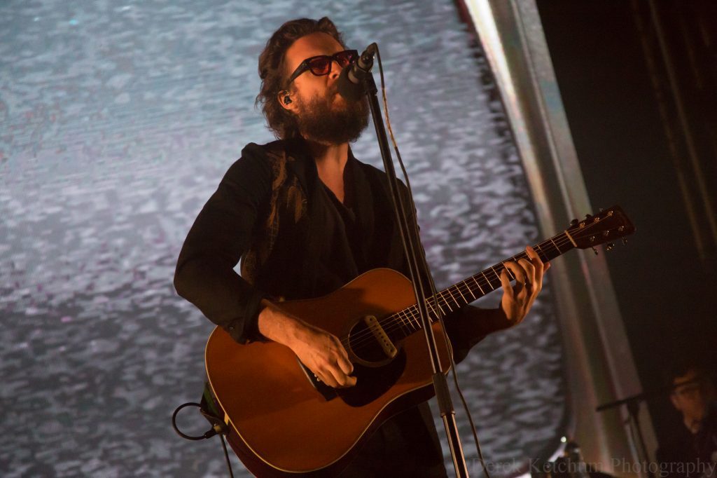 The set began with “Hollywood Forever Cemetery Sings,” a fiery rock number with heavy drums and distorted guitar but with the sheen of Tillman’s smooth voice. Backed by a massive six-piece band featuring drums, bass, guitar, pedal steel guitar, harmonica, and a plethora of keyboards, Tillman had the freedom to lean into his usual stage antics.