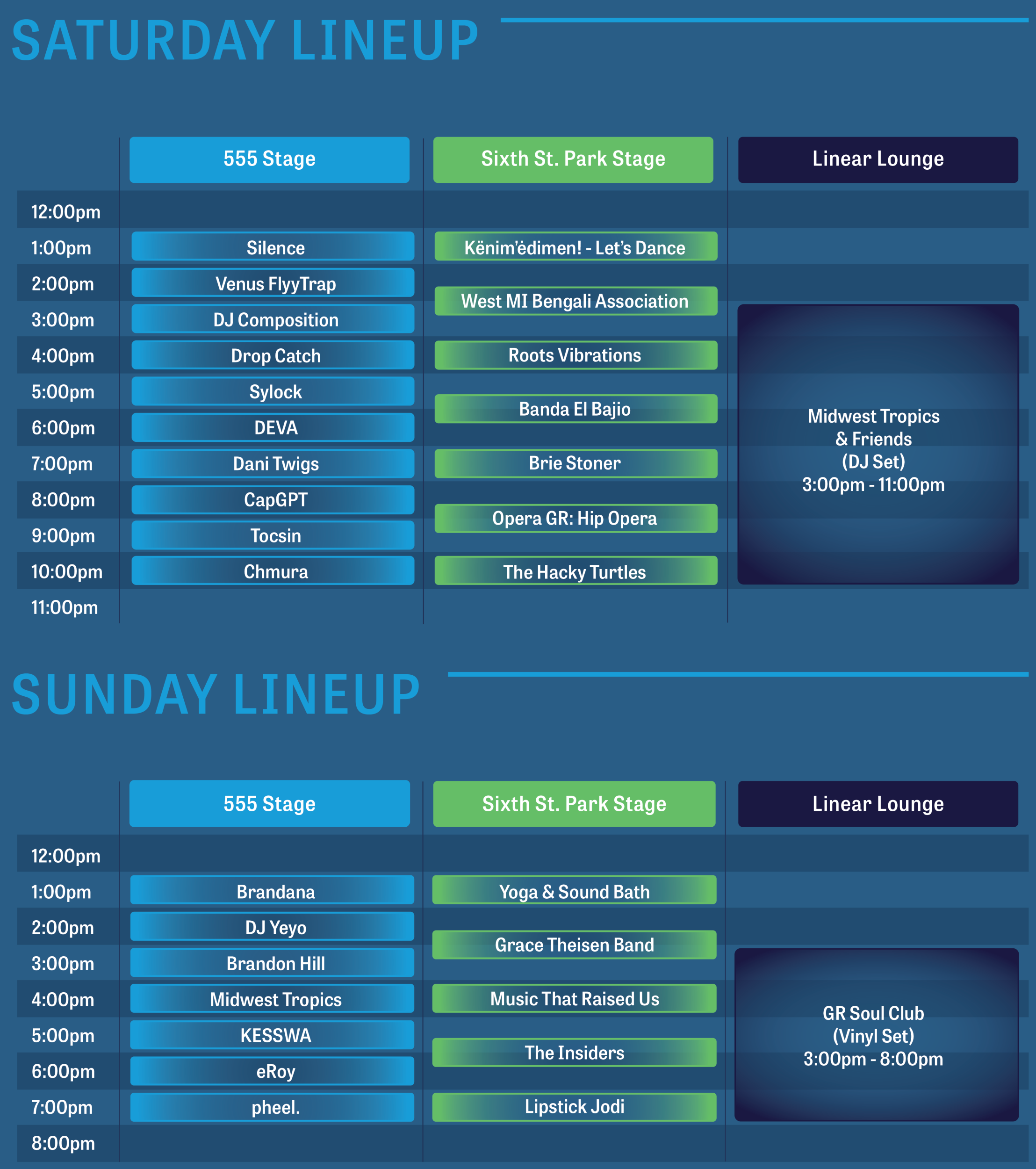 LINEUP: The Hacky Turtles, Grace Theisen Band, Chmura, pheel., Lipstick Jodi, The Insiders Tom Petty Tribute, Music That Raised Us, Brie Stoner, Banda El Bajio and more. View the full schedule below.