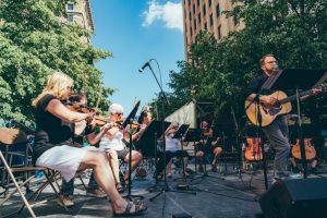 In just a 90-minute stretch wandering from one end of Festival to the other on Friday afternoon, attendees could have caught the Grand Rapids Youth Symphony, a solo pop pianist (Paige Gold), a hip hop artist (Boss Ruff), a youth “drum clinic” (Josh Dunigan), an up-and-coming alt-rock/pop band (Mannhattan), karaoke performances at the WGVU Pop-Up Stage, a guitar-looping one-man band (The Brandino Extravaganza), an indie-rock outfit (Often Home) and the pop-hued St. Sinner Orchestra, a jaunty string ensemble that performed elegantly as a 12-piece band with a drummer, all led beautifully by singer Greg Scheer on acoustic guitar.