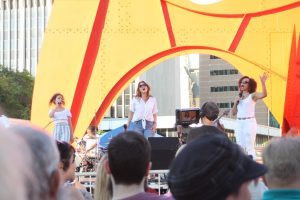 • Special evening opening ceremonies for the 50th anniversary of Festival were hosted on the Calder Stage by Rachel Ruiz of WOOD TV 8 and got under way with performances by members of Grand Rapids’ Circle Theatre. Festival’s history was recounted as Governor Gretchen Whitmer and Grand Rapids Mayor Rosalynn Bliss addressed the crowd, with the “La Grande Vitesse” sculpture, better known to locals as “The Calder,” as a backdrop. As the sun set, those ceremonies gave way to a long night-ending set from Grand Rapids’ own party-leading six-piece, Brena.