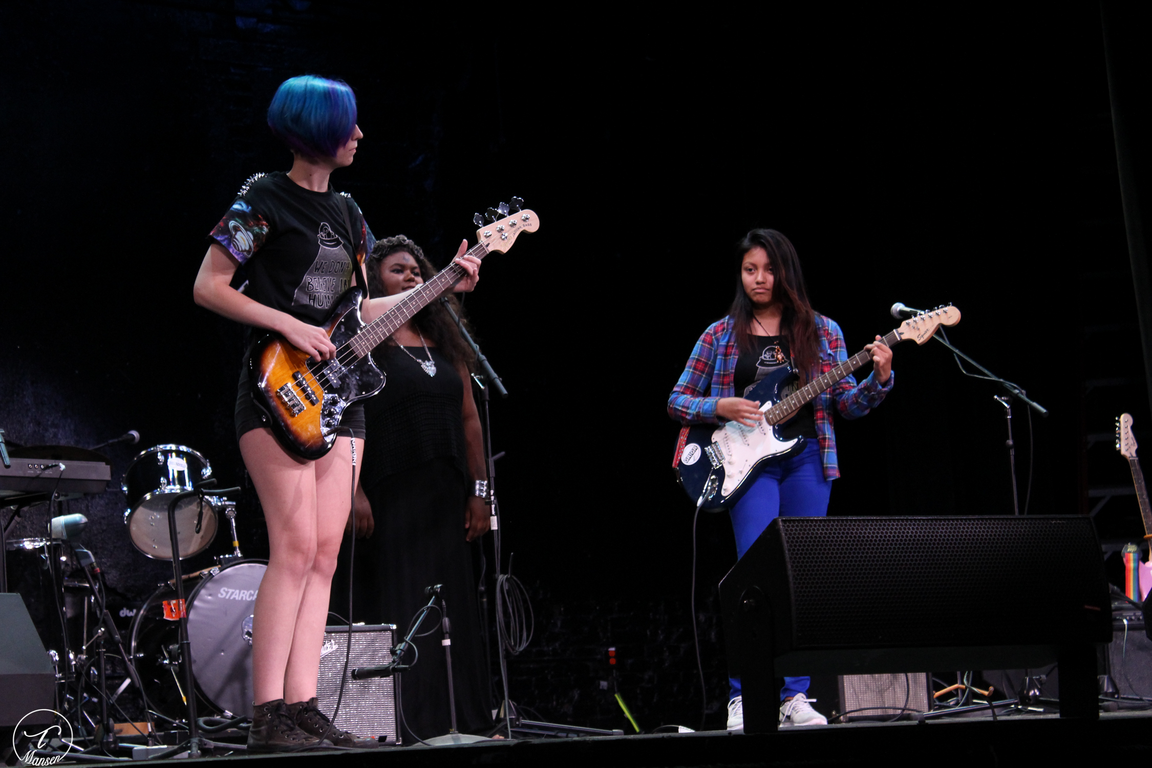 Each band’s ensemble included a set of keys, at least one bass and electric guitar, drums and vocals. After assembling and getting help from coaches, the girls chose a band name, wrote a song and created a band logo for their own band T-shirts, which were screen-printed right outside the theater for purchase.