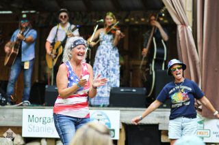Throughout the weekend attendees and artists enjoyed live music during the day in town at venues like Wild Strawberry Cafe, Shamrock, Whisky Point, Print Shop Museum, Breakfast Club, and Daddy Franks where a couple hundred people gathered on Saturday, and partook in what was likely their first clogging workshop amidst a performance by Adrian and Meredith.