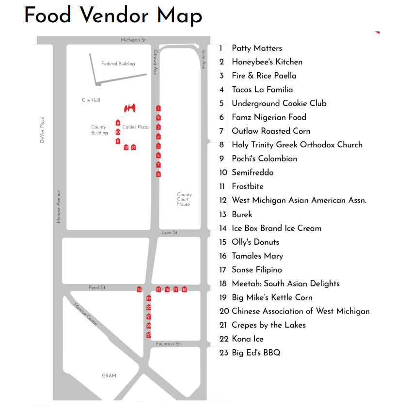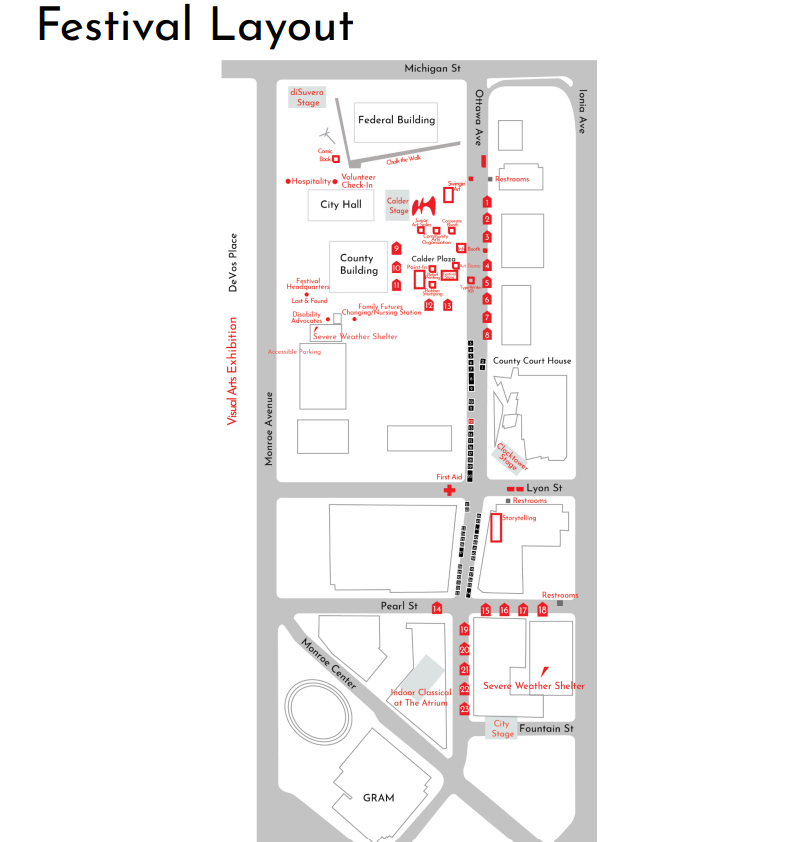 We’ll have 23 food vendors including plenty of food trucks across downtown with taste treats ranging from barbecue and burek to tamales and crepes. Artisan Village, with 46 artists displaying and selling their work, has been moved off Calder Plaza to Ottawa Avenue, which should increase foot traffic for them. (Scroll down for a map of food vendors.)