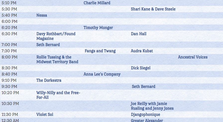 This year’s lineup boasts artists representing a wide swath of styles, including regional stars such as Misty Lyn Bergeron, Cold Tone Harvest, Shari Kane & Dave Steele, Djangophonique, Harper & Midwest Kind, The Barbarossa Brothers, Earth Radio, The Whiskey Charmers, Seth Bernard and scores more.