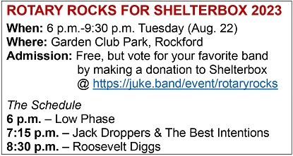 Sponsored and organized by the Rotary Club of Rockford, the second annual, one-day festival kicks off at 6 p.m., with fans “voting” for their favorite band by donating money to ShelterBox, a Rotary-supported agency formed in 2000 that helps those across the globe who’ve lost their homes and belongings to wars or natural disasters.