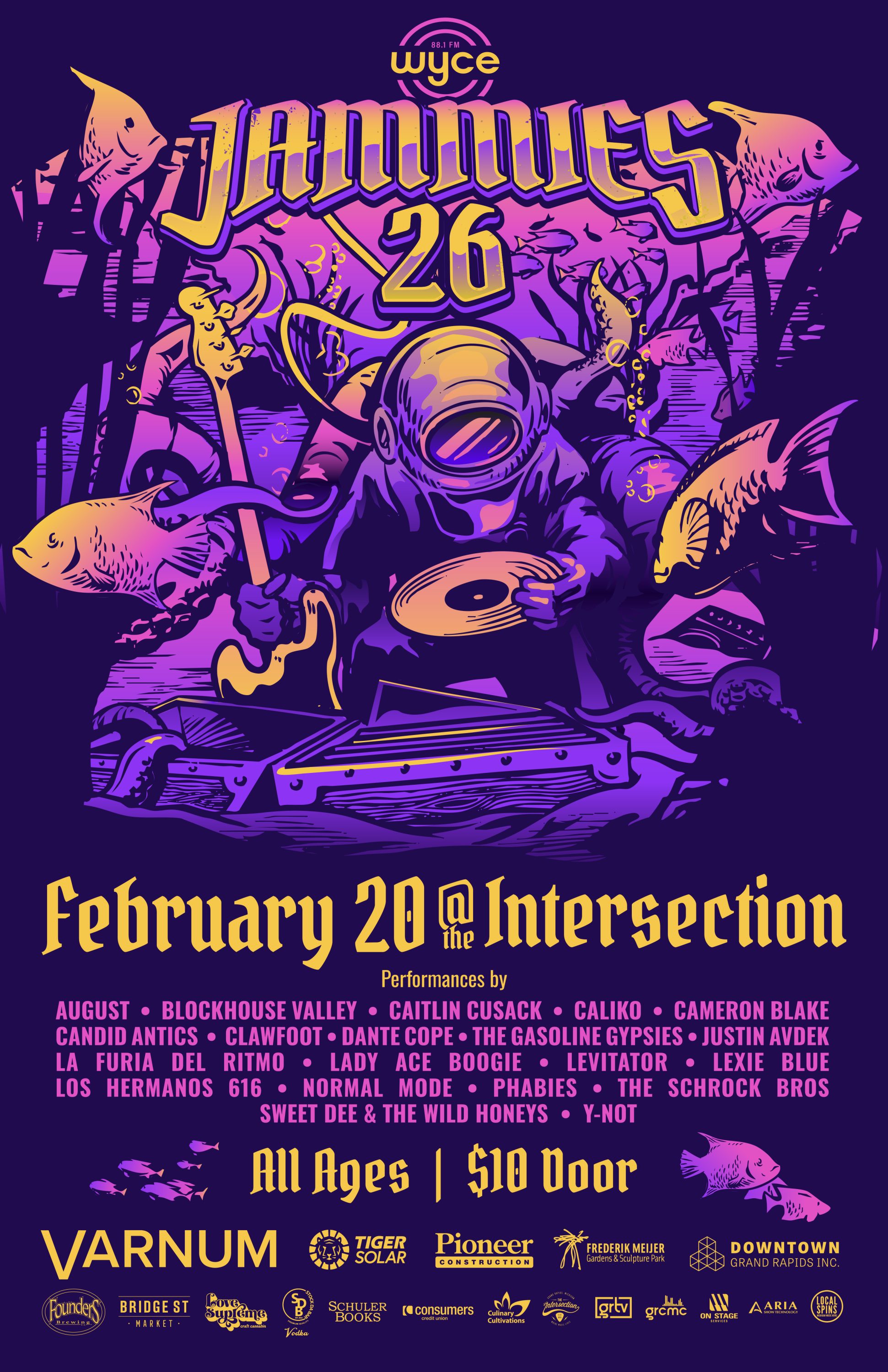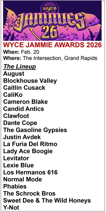The 2026 Jammie Awards presented by Grand Rapids community radio station WYCE (88.1 FM) at The Intersection on Feb. 20 will feature performances by 20 bands and solo artists, representing the biggest Jammies lineup since 2022, with awards presented in a host of categories for the best local and regional music released last year.