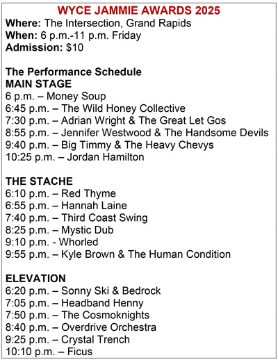 The 25th Jammie Awards, hosted by community radio station WYCE (88.1 FM) rolls out on Friday evening at The Intersection in Grand Rapids, with 18 Michigan acts performing on three stages and awards presented in 18 different categories for the best 2024 releases by Michigan artists.