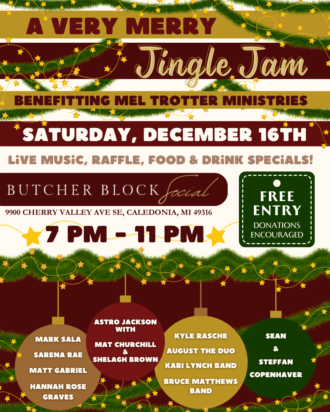 Hence, the 11th “Jingle Jam” unfolds from 7 p.m. to 11 p.m. Saturday (Dec. 16) at Caledonia’s Butcher Block Social, 9900 Cherry Valley Ave. SE, with a who’s who lineup of regional artists.