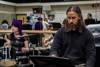 Music teacher Ryan Wallace makes his way through the empty building at a steady pace. He is dressed casually in a green sweater and camouflage cargo pants. His shoulder-length hair sways with each step and his glasses reflect the lights hanging above.