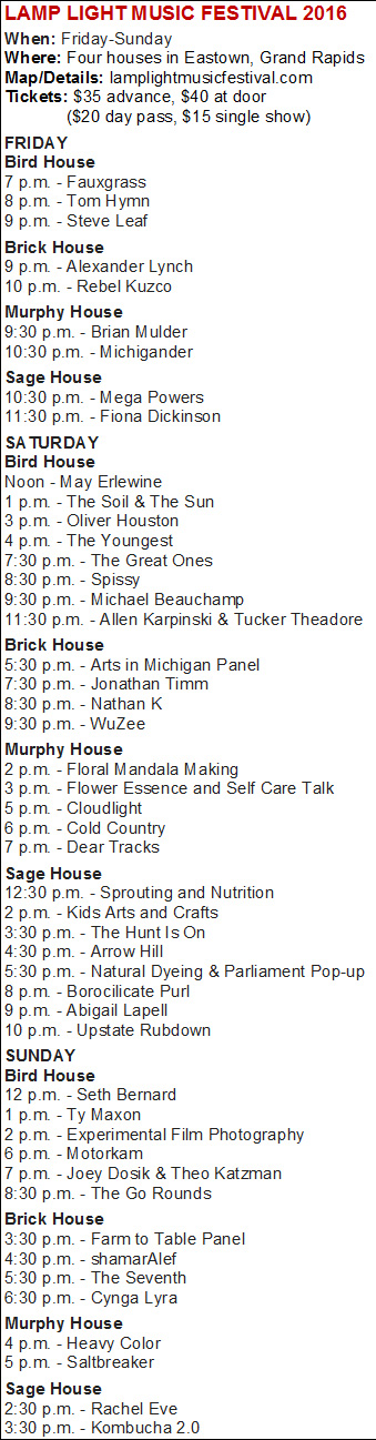 This weekend, the unique music gathering — comprised entirely of house shows — returns to Grand Rapids’ Eastown neighborhood, beginning Friday afternoon. Get tickets ($35 advance weekend; $20 day pass) and see specific locations/addresses at lamplightmusicfestival.com.