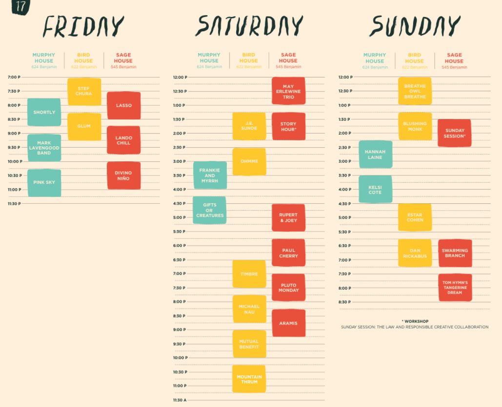 Festival-goers will have the opportunity to alternate between three house venues, dubbed Murphy House, Bird House and Sage House. The close proximity of the venues and staggered set times will allow attendees to catch as many of the 29 performances as possible. (Scroll down to view the full schedule below, and get more details about the lineup online here.)