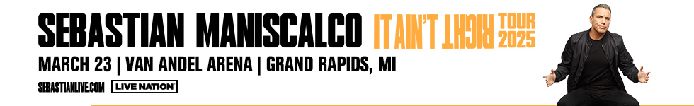 Sebastian Maniscalco Set for Sunday Yuks at Van Andel Arena – After selling out numerous arenas, stand-up comedian and actor Sebastian Maniscalco brings his “It Ain’t Right Tour” to Grand Rapids’ Van Andel Arena at 7 p.m. Sunday. Described by The New York Times as “the hottest commic in America,” Maniscalco — who grew up in the Chicago area — has released six comedy specials over the years and landed the top spot on Pollstar’s roster of “Top Comedy Tours.” Tickets — $49.50 to $175 — are available online at Ticketmaster.com.