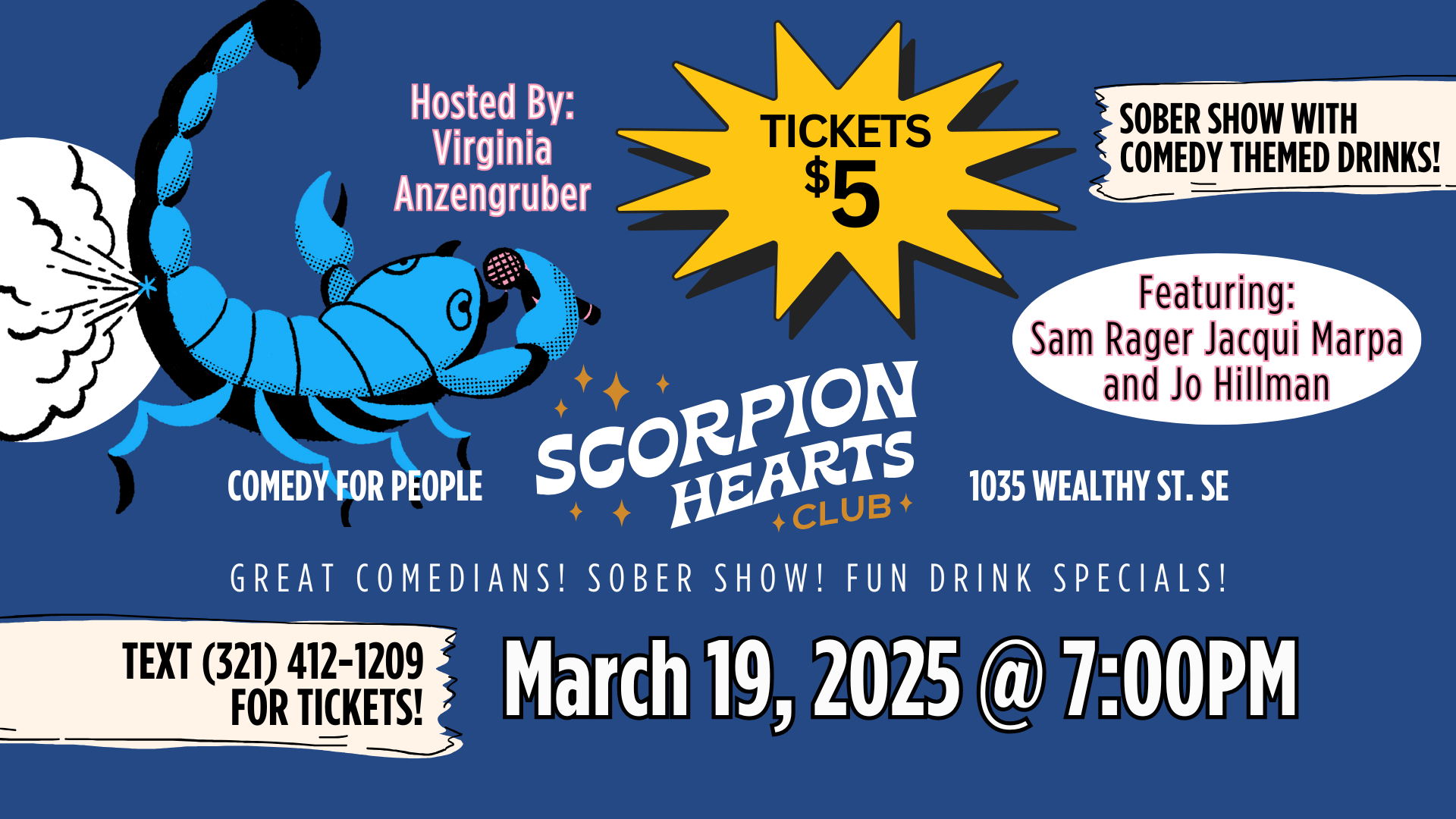 Scorpion Farts Club Sober Comedy Show – Fans of stand-up comedy and earlier bedtimes should rejoice. The return of the fan-favorite Scorpion Farts Club Comedy Show is 7 p.m. Wednesday (March 19) at Scorpion Hearts Club coffee shop in Eastown in Grand Rapids. Hosted by Local Grins author (hey, that’s me!) Virginia Anzengruber, this sober stand-up comedy show features comedy-themed drink specials and highlights the best of the best of Michigan comedians – and the 7 p.m. start time means you can enjoy a night of laughs mid-week without bumping up against midnight. A new twist on an old classic is helping to keep this show sustainable and financially viable for the future, with tickets for this event now costing just $5. Tickets are available by texting 321-412-1209 or at the door.