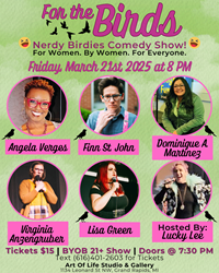 • For the Birds Comedy Show Hosted by Lucky Lee – Comedian and artist Lucky Lee is hosting “For the Birds: Nerdy Birdies Comedy Show” at 8 p.m. March 21 at Art of Life Studio and Gallery, located at 1134 Leonard St. NW, Grand Rapids. The show features a lineup of female and non-binary identifying comedians, including Finn St. John, Lisa Green, Dominique A. Martinez, Virginia Anzengruber, and Angela Verges. Tickets are $15 and available by texting (616) 401-2603.