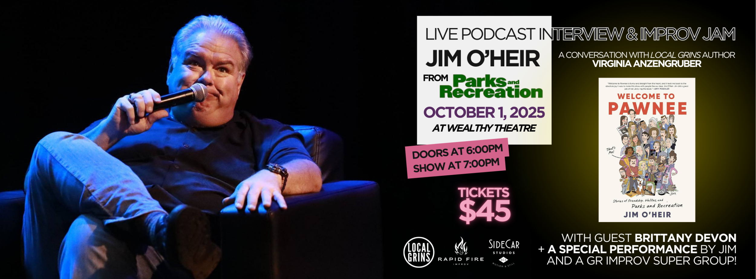 Jerry Gergich Will Slide Into Your DMs – Local Grins readers rejoice: Our very first “Local Grins LIVE” event is happening on Wednesday, Oct. 1 at 7 p.m. at Wealthy Theatre in Grand Rapids. An Evening with Jim O’Heir features an intimate live conversation with actor Jim O’Heir, known best to audiences as Jerry Gergich from NBC’s “Parks and Recreation,” with Local Grins author and comedian Virginia Anzengruber. The show will open with stand-up from comedian Brittany Devon, and after the conversation and audience Q&A portion, the evening will conclude with a SPECIAL PERFORMANCE of a super group of Grand Rapids improvisers (including Rapid Fire Improv and Half Hazard), featuring Jim O’Heir as guest monologist! Tickets are still available – but moving fast – at https://grcmc.vbotickets.com/event/An_Evening_With_Jim_OHeir/170811.