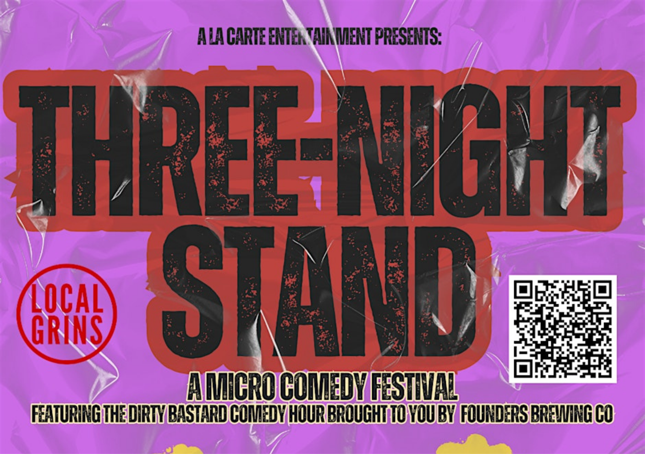 A la Carte Comedy Hosting a Three-Night Stand – A la Carte Comedy, produced by comedian Alastair Watt, is hosting the inaugural Three-Night Stand, a comedy micro-festival proudly sponsored by Founders Brewing Co. — packed with stand-up, improv and local legends. Three nights. Three flavors of comedy. One unforgettable weekend. Tickets are available for all three nights now at https://www.eventbrite.com/cc/three-night-stand-a-comedy-festival-4383223. Here’s what’s going down: