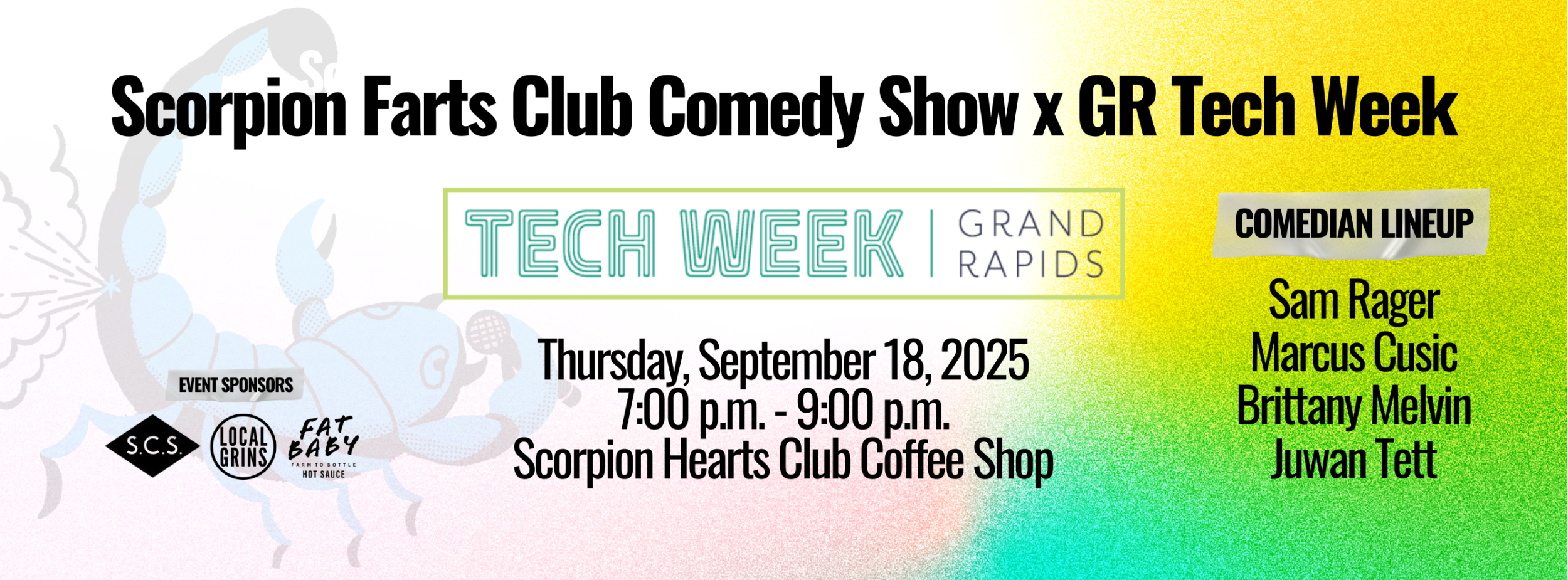 Tech Week Grand Rapids Comedy Night – It’s a sober stand-up comedy show. Local Spins author of the #LocalGrins column Virginia Anzengruber is hosting the 2025 Tech Week Grand Rapids edition of the #ScorpionFartsClubComedyShow. Sponsored by Fat Baby Hot Sauce, Local Spins and Sidecar Studios, the $5 tickets make this one of the most accessible comedy shows in the Midwest. We’ll have a Tech Week/comedy-themed drink at this sober show (announcing soon) and our lineup features headliner Sam Rager (“Don’t Tell Comedy”), as well as Marcus Cusic (two-time Anime Expo Comedy Champion), and Brittany Melvin with special guest Juwan Tett. Register and get $5 tickets online here: https://docs.google.com/…/1FAIpQLSdHnwswLOlx1I…/viewform