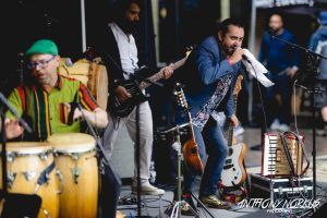 • Cabildo {Julio Cano-Villalobos, Julio Cesar Viveros, Dustin Miller, Jonathan Sgromo, Nate Bliton, Micheal Prokpupchuck, Josh Dunigan, Joshua Usadel) – Rain subsided as the eight-piece Latin fusion band took the stage. A wall of sound including strings, trombone, two guitars, bass, drums and auxiliary percussion excited the crowd. Integrating sounds of cumbia, ska and South American genres, the band picked up the pace and within minutes dancing, clapping and smiles filled the audience.