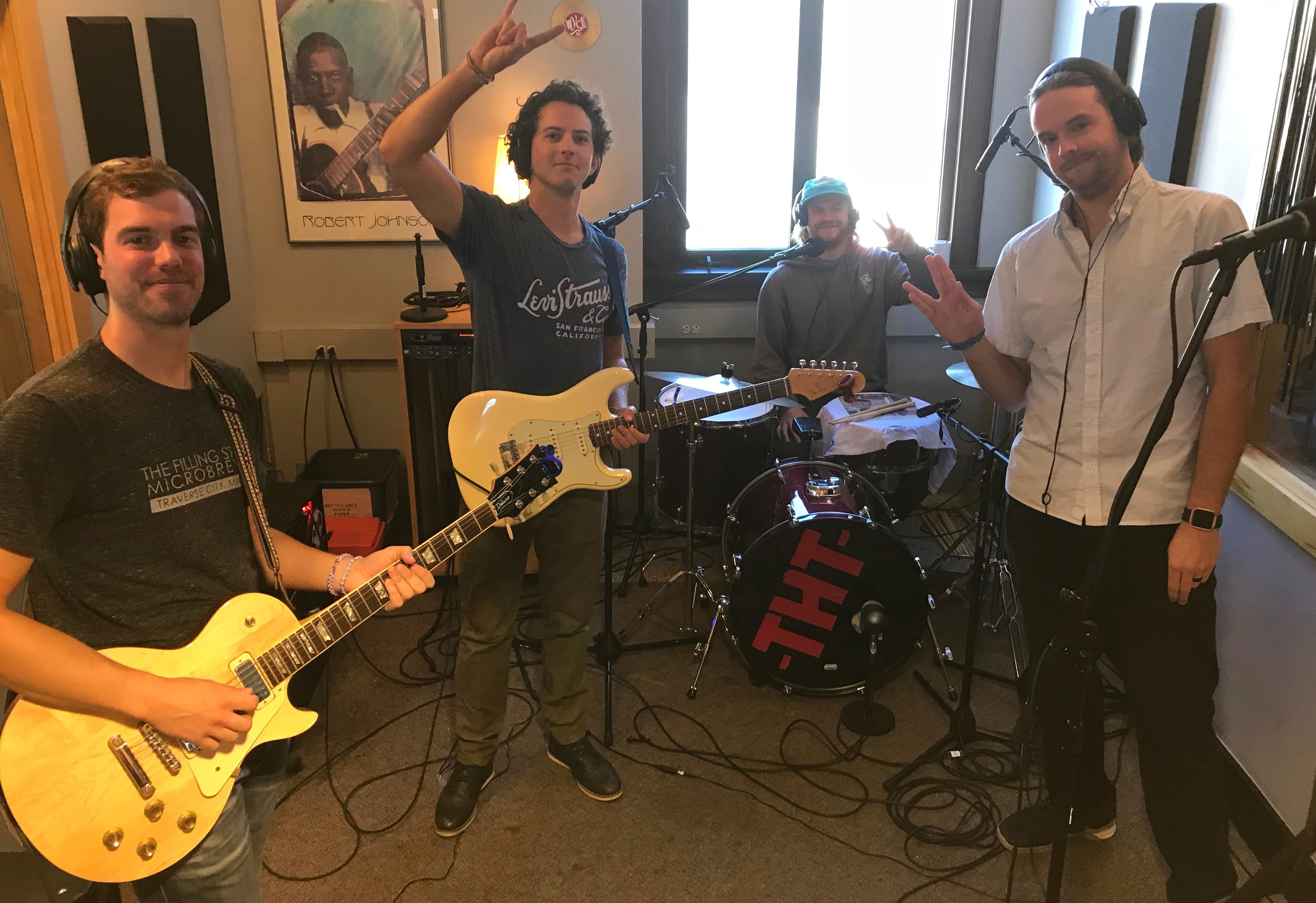The in-studio, on-air visit by The Hacky Turtles — singer Marc Kanitz, guitarists Alex Rushlow and Austin Spencer, and drummer Erik Krueger — saw the genre-mingling funk-rock/folk foursome churn out lively renditions of “TacoCat” and “Hot Hot.” (Read a Local Spins Artist Spotlight feature on The Hacky Turtles here.)