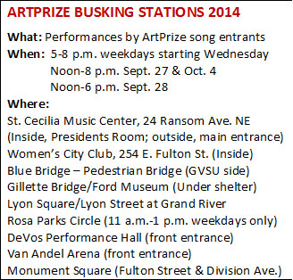 Other busking stations will be active 5-8 p.m. weekdays and noon-8 p.m. Saturdays and Sundays. They will be marked by sandwich boards, upon which musicians can attach their voting identification numbers. The busking schedule is posted at artprize.org.