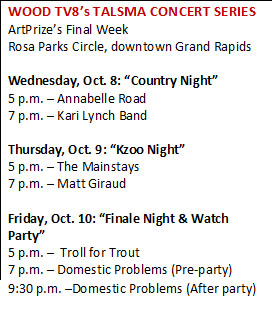 Rosa Parks Circle, for instance, is scheduled as a busking location 11 a.m.-1 p.m. weekdays. Rosa Parks Circle also is hosting WOOD TV8’s Talsma Concert Series Oct. 8-10 during ArtPrize’s final week, with Domestic Problems, Matt Giraud, Troll for Trout, Kari Lynch Band, The Mainstays and Annabelle Road performing. (See the full schedule at right.)