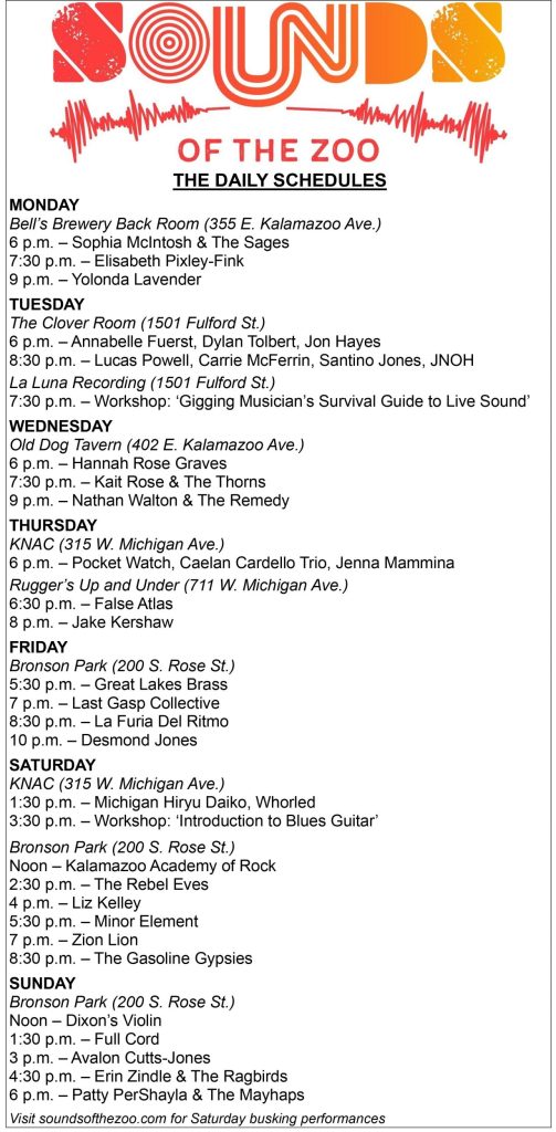 As Hudson-Prenkert pointed out, Monday’s powerful lineup was just the beginning of a packed week of shows at seven other Kalamazoo venues. Tonight (Tuesday), seven different performers will light up the Clover Room at 1501 Fulford St. starting at 6 p.m., with a “Gigging Musician’s Survival Guide to Live Sound” workshop next door at La Luna Recording and Sound at 7:30 p.m. Scroll down to view the full schedule for the week.