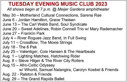 Ask any performer pumping up this season’s expanded edition of the Tuesday Evening Music Club concert series and they’ll gush that there’s nothing like getting a chance to play the big stage at Frederik Meijer Gardens & Sculpture Park.