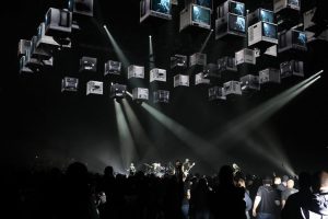 And it’s not just about pyro and pedestals. A series of cubes with LED screens hanging over the square stage showed everything from vintage footage to abstract imagery and even bizarre cartoon animals; they were raised and lowered independently so they could be arranged in a variety of patterns, to often stunning effect.