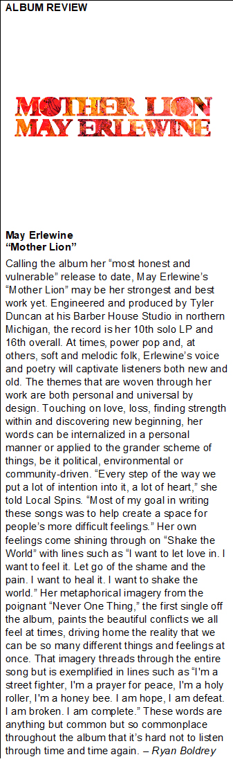 Erlewine releases her new recording exclusively for Michigan fans first, playing release shows in Grand Rapids, Spring Lake, Kalamazoo and beyond. Get the back story and album review at Local Spins.