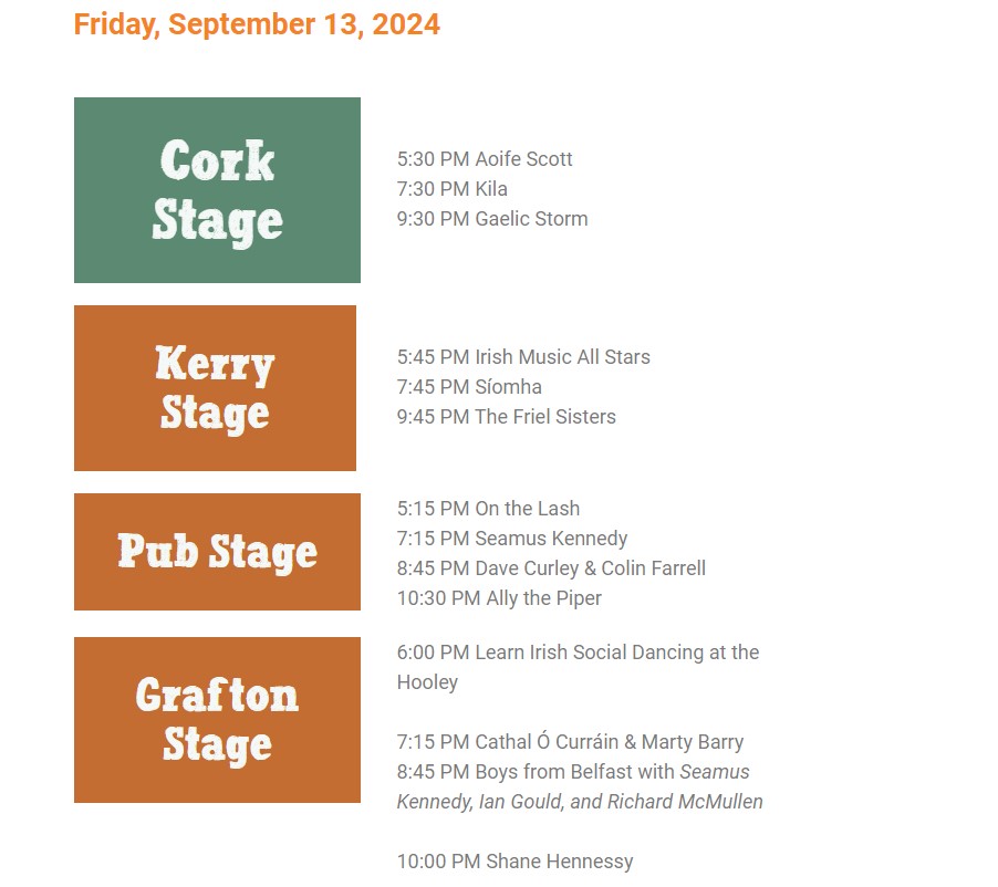 THE LINEUP: Kila, Gaelic Storm, Talisk, On the Lash, Shane Hennesy, Ally the Piper, JigJam, Ian Gould, Aoife Scott, Kennedy’s Kitchen, Blackthorn, Ironwood, Seamus Kennedy, Conklin Ceili Band, Siomha and many more. Full lineup online here.