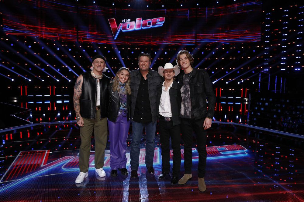 The Voice — “Live Top 16 Performances” Episode 2216B — Pictured: (l-r) Bodie, Rowan Grace, Blake Shelton, Bryce Leatherwood, Brayden Lape — (Photo by: Trae Patton/NBC)