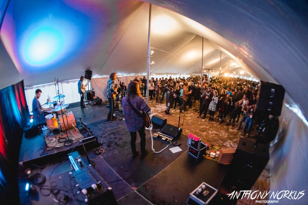 Frontman Joe Bockheim – who told a story about meeting his then-future wife at Perrin – led the rock ‘n’ roll charge with an uber-animated set of new and classic Legal Immigrants’ tunes, followed by Kalamazoo’s always fetching and distinctive The Go Rounds, with lead singer Graham Parsons congratulating attendees for celebrating outdoors in mid-winter inside a big tent.