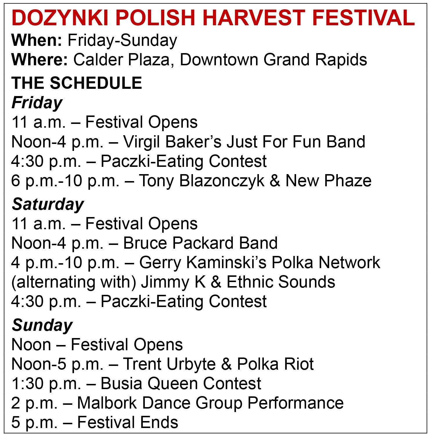 Or the families that toast Polish culture at festivals and celebrations, dancing deep into the night to groups such as Gerry Kaminski’s Polka Network, which will headline Saturday night’s Dozynki Polish Harvest Festival on Grand Rapids’ Calder Plaza.