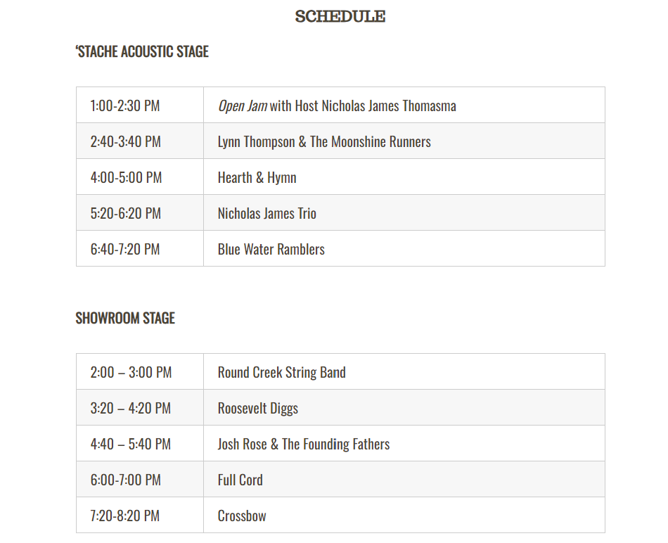 That will be followed by Lynn Thompson & The Moonshine Runners, Hearth & Hymn, Nicholas James Trio and Blue Water Ramblers.