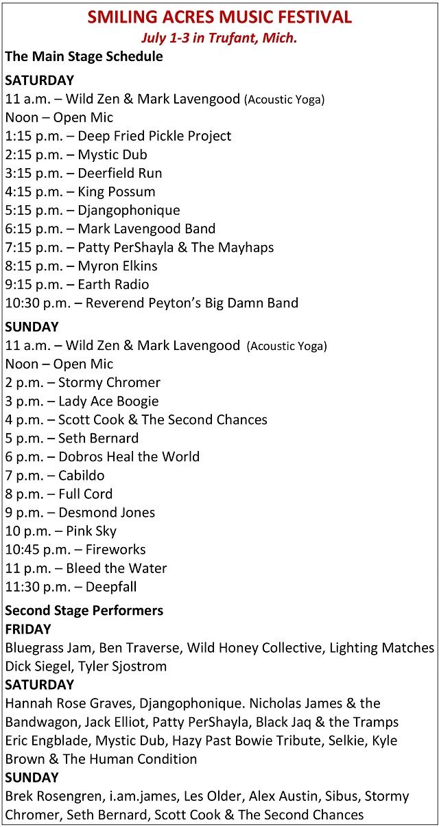 Lavengood — whose band plays the Main Stage at 5:15 p.m. today (Saturday) – spent much of Friday dashing to and fro, putting out the usual first-day fires when it comes to minor glitches and crises that always emerge at multi-day camping events with dozens of performances on two stages, along with late-night “fireside acoustic” sessions. The festival continues Saturday and Sunday; day passes are $35 and available at smilingacres.org.